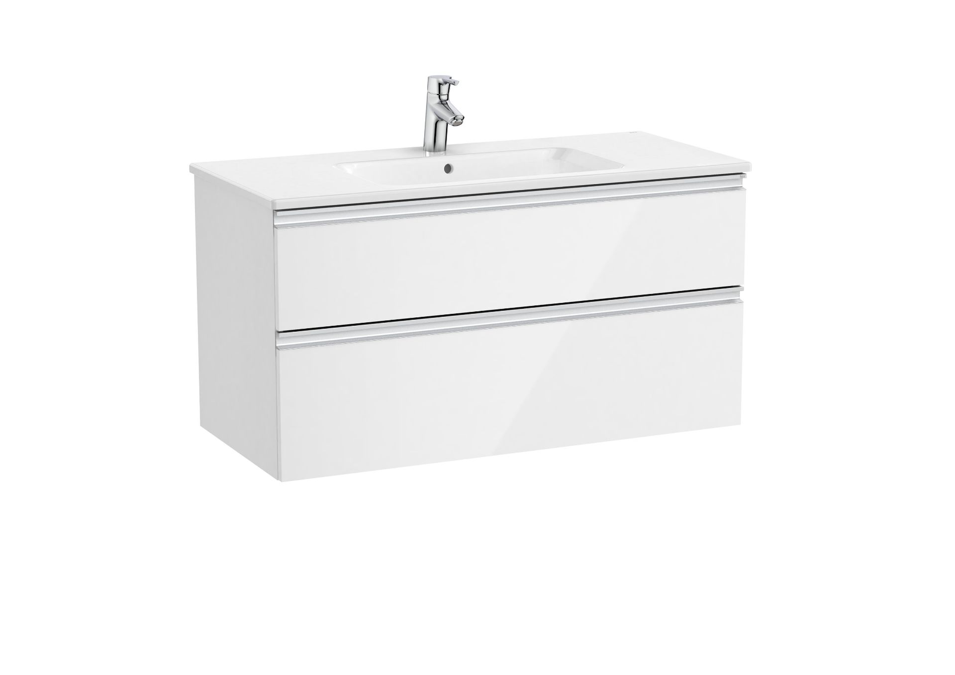 Unik GAP. Conjunto de mueble base dos cajones modelo GAP y lavabo centrado. Acabado blanco brillo medida 1000x460. Cajones con cierre amortiguado. No incluye grifería