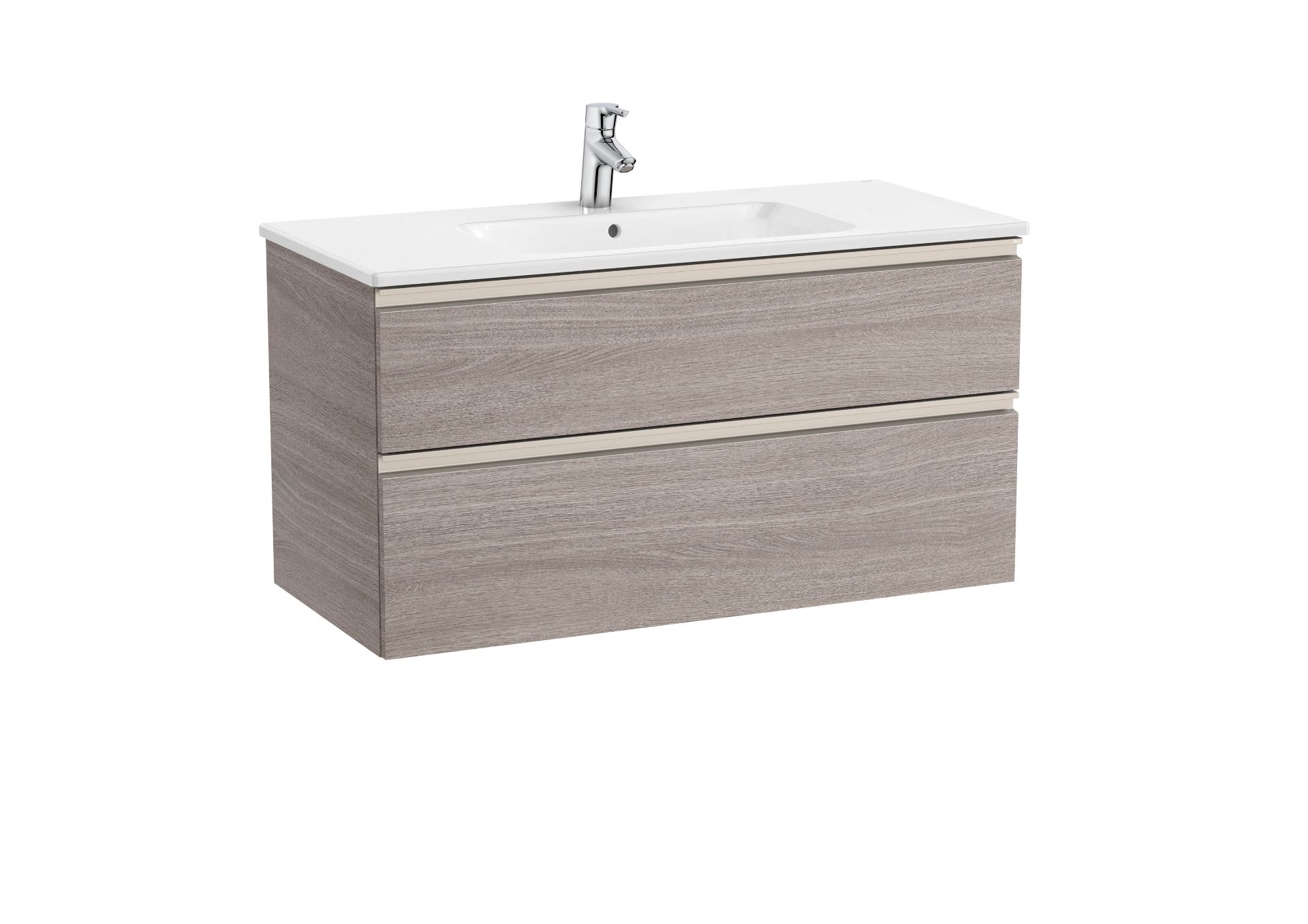 Unik GAP. Conjunto de mueble base dos cajones modelo GAP y lavabo centrado. Acabado roble city medida 1000x460. Cajones con cierre amortiguado. No incluye grifería