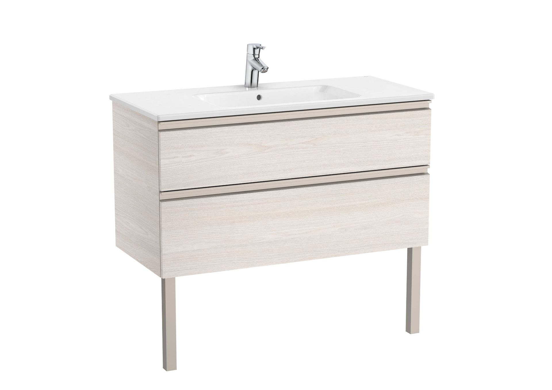 Unik GAP. Conjunto de mueble base dos cajones modelo GAP y lavabo centrado. Acabado fresno nórdico medida 1000x460. Cajones con cierre amortiguado. No incluye grifería
