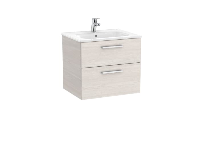 Unik VICTORIA. Conjunto de mueble base dos cajones modelo VICTORIA y lavabo centrado. Acabado fresno nórdico medida 600x453. Cajones con cierre amortiguado. No incluye grifería