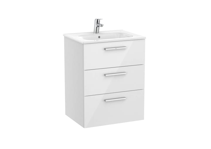 Unik VICTORIA FAMILY. Conjunto de mueble base tres cajones modelo VICTORIA FAMILY y lavabo centrado. Acabado blanco brillo medida 600x453. Cajones con cierre amortiguado. No incluye grifería