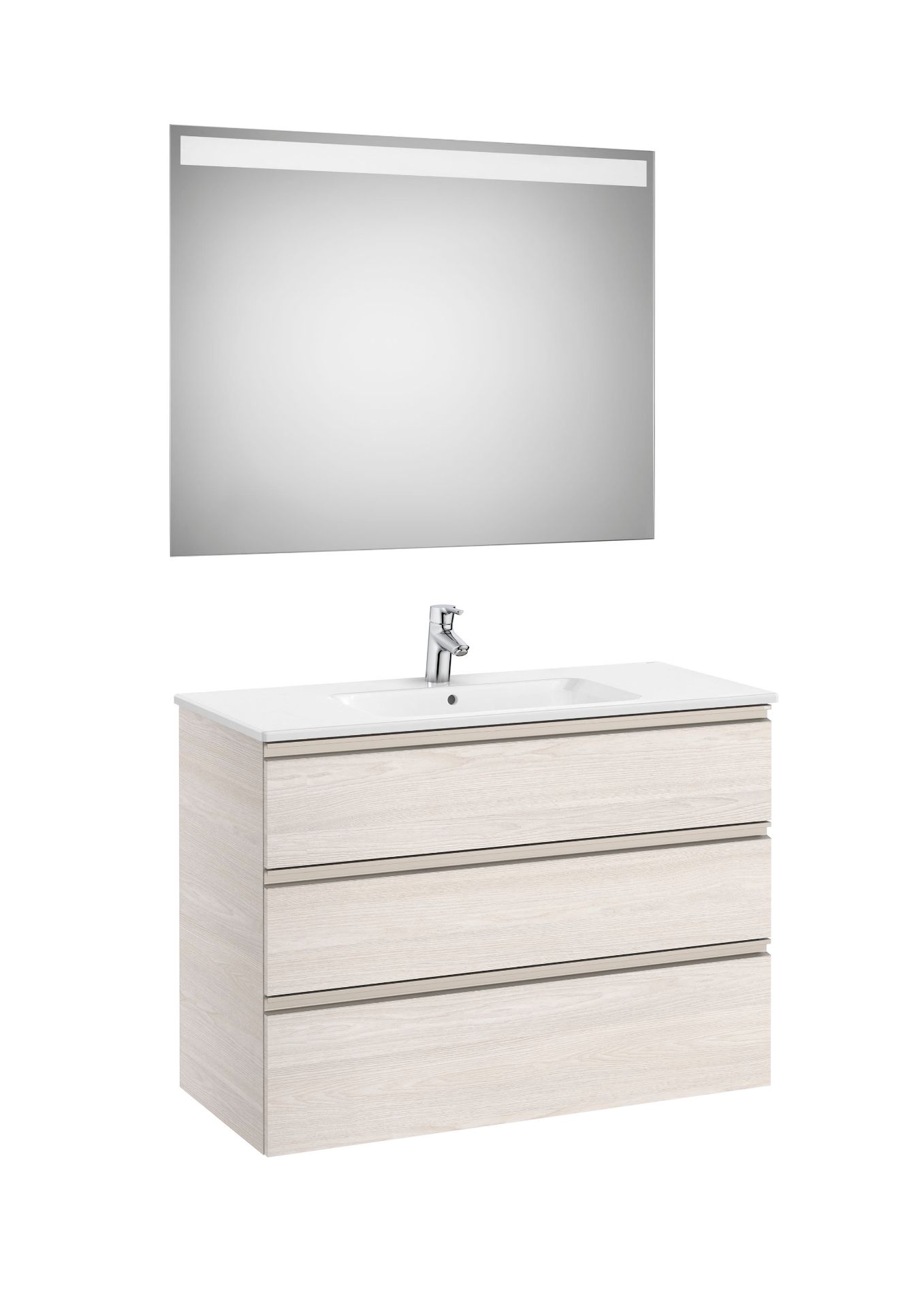 Pack GAP. Conjunto de mueble base tres cajones modelo GAP con lavabo centrado y espejo EIDOS . Acabado fresno nórdico medida 1000x460. Cajones con cierre amortiguado. No incluye grifería