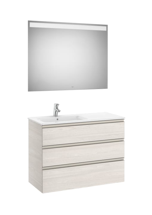 Pack GAP. Conjunto de mueble base tres cajones modelo GAP con lavabo desplazado a la izquierda y espejo EIDOS . Acabado fresno nórdico medida 1000x460. Cajones con cierre amortiguado. No incluye grifería