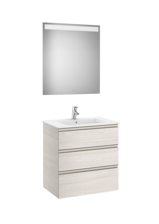 Pack GAP. Conjunto de mueble base tres cajones modelo GAP con lavabo centrado y espejo EIDOS . Acabado fresno nórdico medida 700x460. Cajones con cierre amortiguado. No incluye grifería