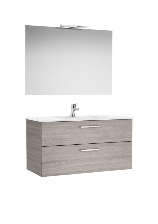 Pack VICTORIA. Conjunto de mueble base dos cajones modelo VICTORIA con lavabo centrado, espejo y aplique led . Acabado roble city medida 1000x453. Cajones con cierre amortiguado. No incluye grifería