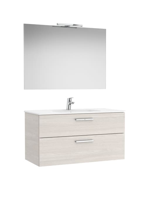 Pack VICTORIA. Conjunto de mueble base dos cajones modelo VICTORIA con lavabo centrado, espejo y aplique led . Acabado fresno nórdico medida 1000x453. Cajones con cierre amortiguado. No incluye grifería