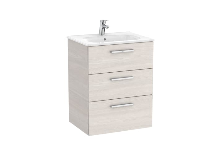 Unik VICTORIA FAMILY. Conjunto de mueble base tres cajones modelo VICTORIA FAMILY y lavabo centrado. Acabado fresno nórdico medida 600x453. Cajones con cierre amortiguado. No incluye grifería