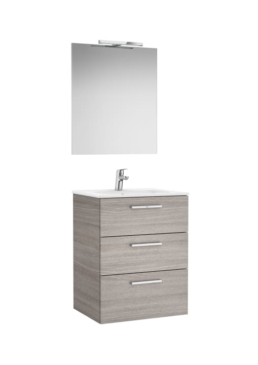 Pack VICTORIA FAMILY. Conjunto de mueble base tres cajones modelo VICTORIA FAMILY con lavabo centrado, espejo y aplique led . Acabado roble city medida 600x453. Cajones con cierre amortiguado. No incluye grifería