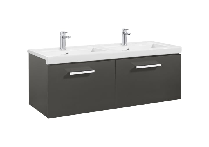 Unik PRISMA. Mueble base compuesto por dos módulos de un cajón modelo PRISMA y lavabo doble. El mueble incluye un cajón interior. Acabado gris antracita medida 1200x460. Sifón ahorra espacio incluido. No incluye grifería