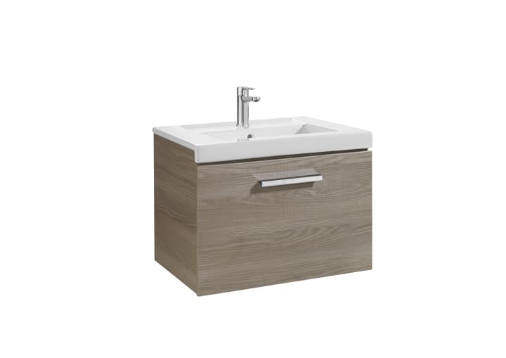 Unik PRISMA. Mueble base con un cajón modelo PRISMA y lavabo centrado. El mueble incluye un cajón interior. Acabado fresno medida 600x460. Sifón ahorra espacio incluido. No incluye grifería