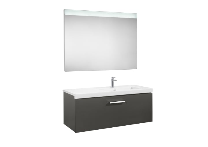PACK - Conjunto de mueble base, lavabo de sobremueble con cubeta en la derecha y espejo Prisma Basic con luz LED integrada en la parte superior. Sifón ahorra espacio incluido. No incluye patas ni grifería.