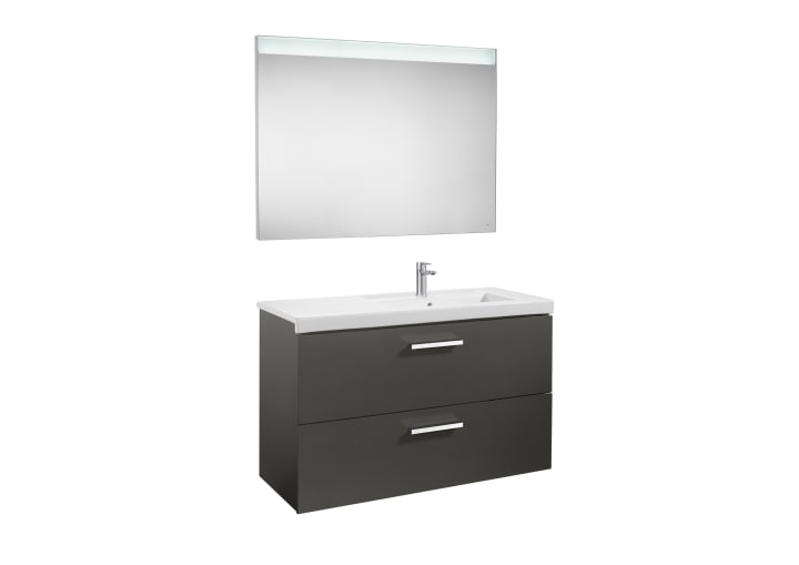 PACK, MUEBLE LAVABO Y ESPEJO, MODELO PRISMA 2 CAJONES ACABADO GRIS ANTRACITA Y LAVABO DESPLAZADO a dcha. MEDIDA 1100X460