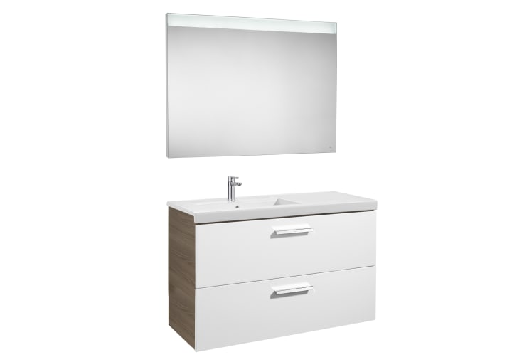 PACK, MUEBLE LAVABO Y ESPEJO, MODELO PRISMA 2 CAJONES ACABADO FRENTE BLANCO BRILLO Y LATERALES FRESNO Y LAVABO DESPLAZADO a izda. MEDIDA 1100X460