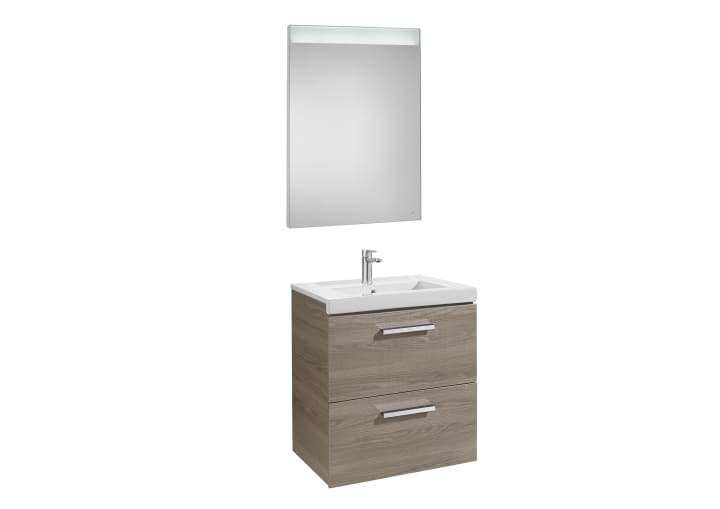 Pack PRISMA. Mueble con dos cajones PRISMA, lavabo centrado y espejo PRISMA con led integrada . Mueble con cajón interior. Acabado fresno medida 600x460. Sifón ahorra espacio incluido. No incluye grifería