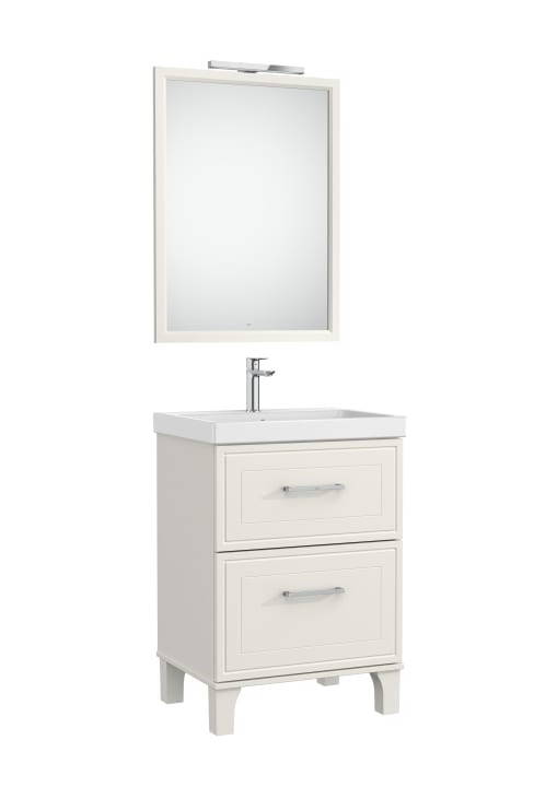 Pack ROMEA. Conjunto de mueble de dos cajones modelo ROMEA, lavabo centrado y espejo ROMEA con aplique led STARLIGHT. Patas integradas. Acabado blanco mate satinado medida 600x460. Cajón con cierre amortiguado. No incluye grifería
