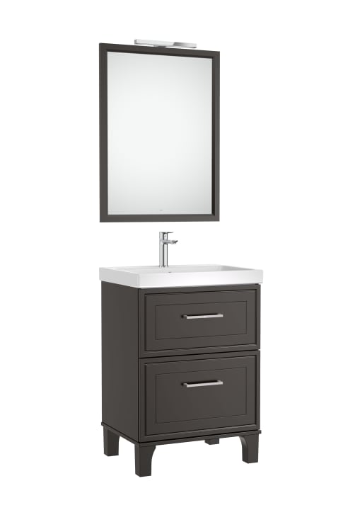 Pack ROMEA. Conjunto de mueble de dos cajones modelo ROMEA, lavabo centrado y espejo ROMEA con aplique led STARLIGHT. Patas integradas. Acabado gris oscuro satinado medida 600x460. Cajón con cierre amortiguado. No incluye grifería