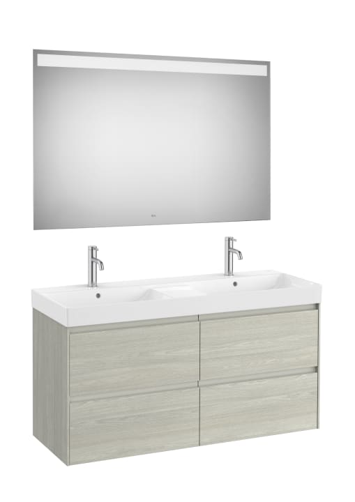 Pack ONA . Conjunto de mueble base cuatro cajones modelo ONA con lavabo doble Fineceramic y espejo EIDOS . Acabado roble claro medida 1200x460. Cajones con cierre amortiguado. No incluye grifería