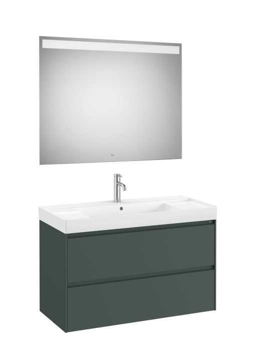 Pack ONA . Conjunto de mueble base dos cajones modelo ONA con lavabo Fineceramic y espejo EIDOS . Acabado verde mate medida 1000x460. Cajones con cierre amortiguado. No incluye grifería