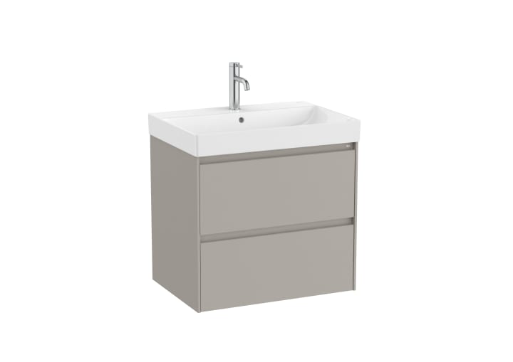 Unik ONA. Conjunto de mueble base dos cajones modelo ONA y lavabo Fineceramic. Acabado gris mate medida 650x460. Cajones con cierre amortiguado. No incluye grifería