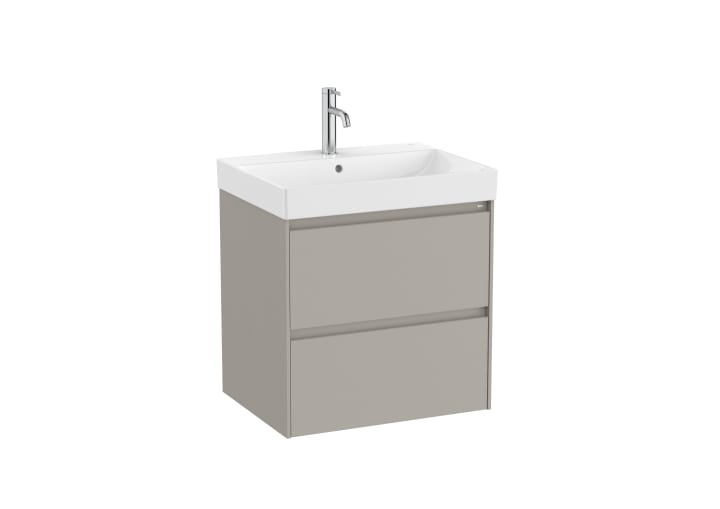 Unik ONA. Conjunto de mueble base dos cajones modelo ONA y lavabo Fineceramic. Acabado gris mate medida 600x460. Cajones con cierre amortiguado. No incluye grifería