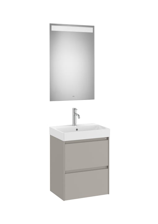 PACK - Conjunto de mueble base compacto de dos cajones, lavabo y espejo Eidos con luz LED integrada en la parte superior. No incluye patas ni grifería.