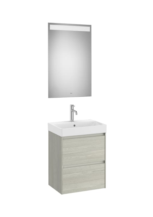 PACK COMPACTO, MUEBLE Y LAVABO FONDO REDUCIDO Y ESPEJO MODELO ONA ACABADO ROBLE CLARO MATE Y MEDIDA 500X360