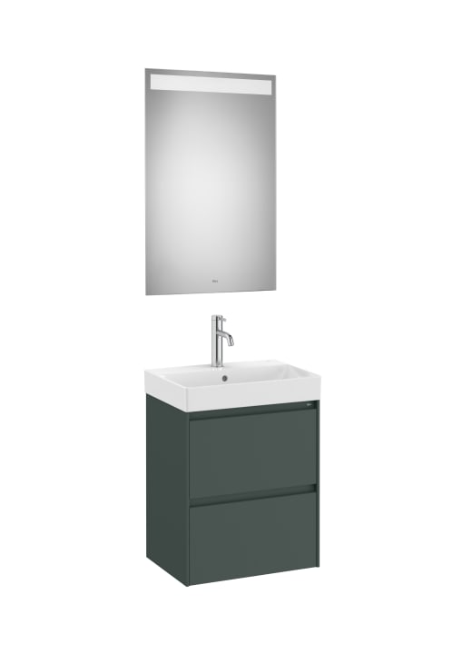 Pack ONA compac . Conjunto de mueble base dos cajones modelo ONA con lavabo Fineceramic compacto fondo reducido y espejo EIDOS . Acabado verde mate medida 500x360. Cajones con cierre amortiguado. No incluye grifería