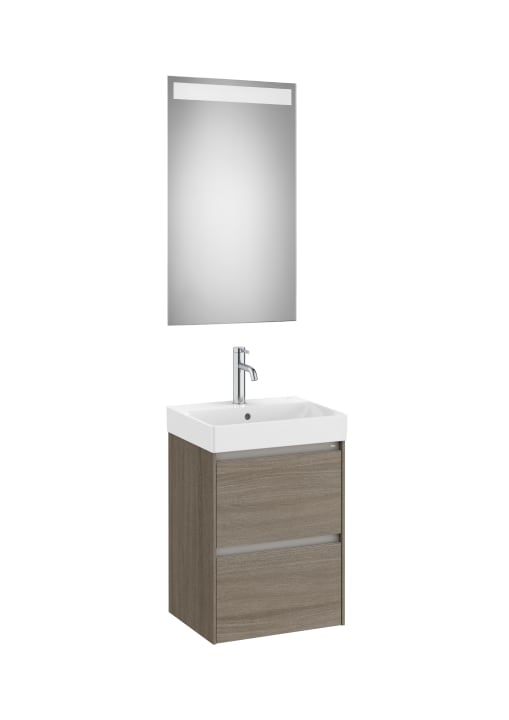 PACK COMPACTO, MUEBLE Y LAVABO FONDO REDUCIDO Y ESPEJO MODELO ONA ACABADO OLMO OSCURO Y MEDIDA 450X360