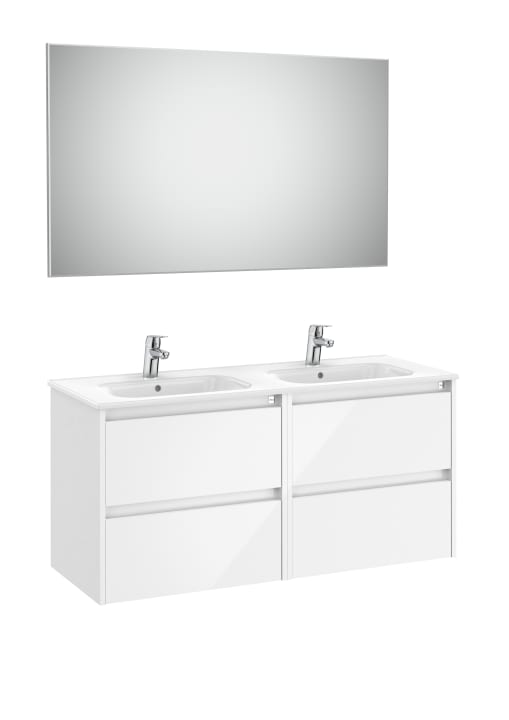 Pack TENET. Conjunto de mueble base cuatro cajones modelo TENET con lavabo doble, espejo y aplique led. Acabado blanco brillo medida 1200x453. Cajones con cierre amortiguado. No incluye grifería