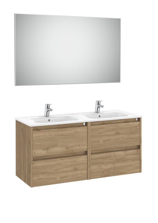 Pack TENET. Conjunto de mueble base cuatro cajones modelo TENET con lavabo doble, espejo y aplique led. Acabado nogal medida 1200x453. Cajones con cierre amortiguado. No incluye grifería