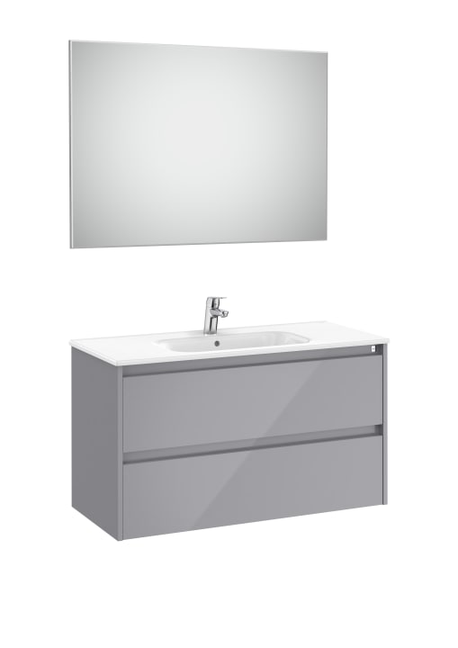 Pack TENET. Conjunto de mueble base dos cajones modelo TENET con lavabo, espejo y aplique led. Acabado gris brillo medida 1000x453. Cajones con cierre amortiguado. No incluye grifería