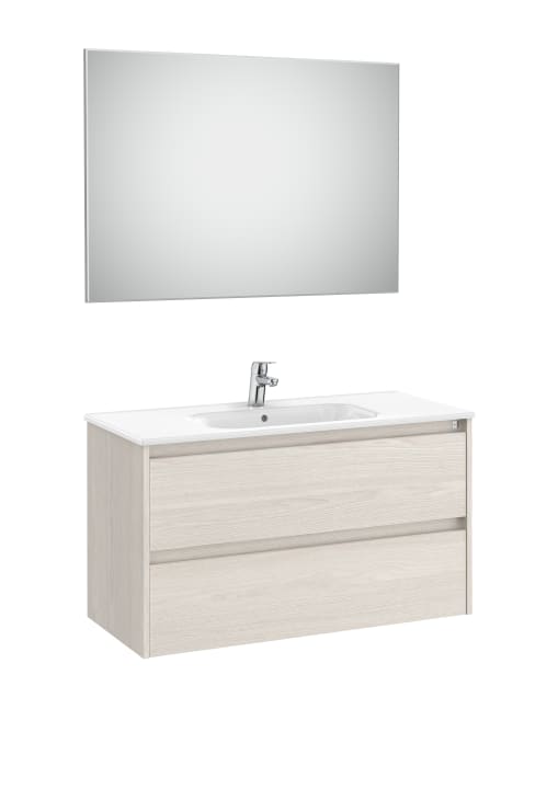 PACK, MUEBLE LAVABO Y ESPEJO, MODELO TENET 2 CAJONES ACABADO NORDIC ASH Y LAVABO. MEDIDA 1000X453