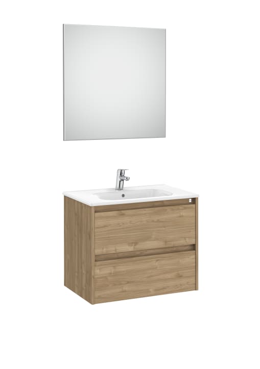 Pack TENET. Conjunto de mueble base dos cajones modelo TENET con lavabo, espejo y aplique led. Acabado nogal medida 700x453. Cajones con cierre amortiguado. No incluye grifería