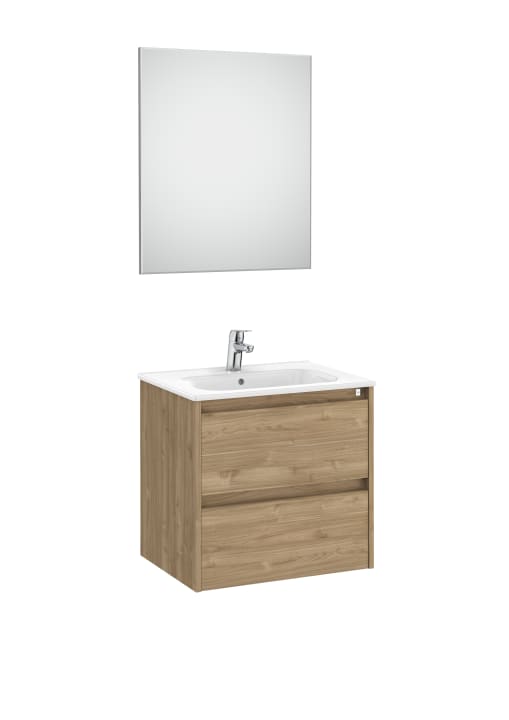 Pack TENET. Conjunto de mueble base dos cajones modelo TENET con lavabo, espejo y aplique led. Acabado nogal medida 600x453. Cajones con cierre amortiguado. No incluye grifería