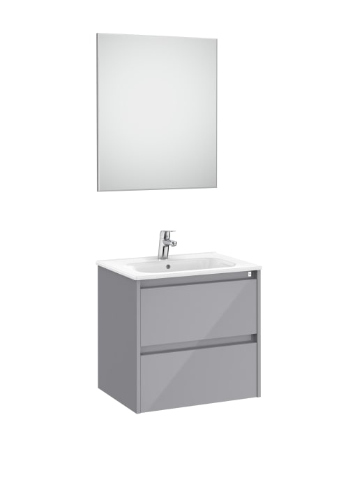 Pack TENET. Conjunto de mueble base dos cajones modelo TENET con lavabo, espejo y aplique led. Acabado gris brillo medida 600x453. Cajones con cierre amortiguado. No incluye grifería