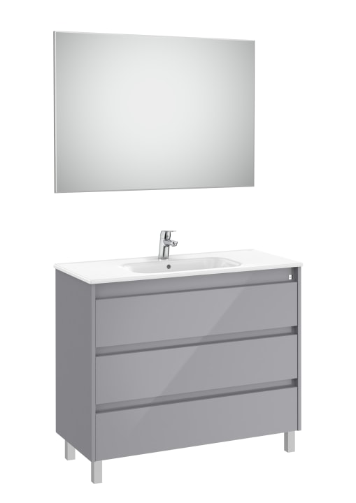 Pack TENET. Conjunto de mueble base tres cajones modelo TENET con lavabo, espejo y aplique led. Acabado gris brillo medida 1000x453. Cajones con cierre amortiguado. No incluye grifería
