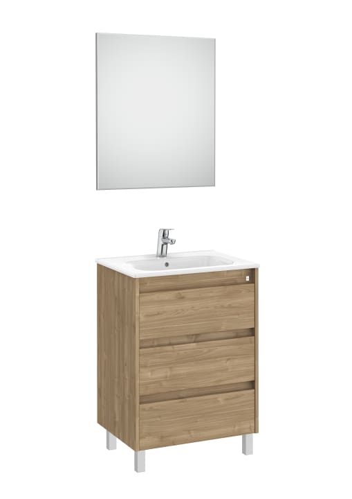 Pack TENET. Conjunto de mueble base tres cajones modelo TENET con lavabo, espejo y aplique led. Acabado nogal medida 600x453. Cajones con cierre amortiguado. No incluye grifería