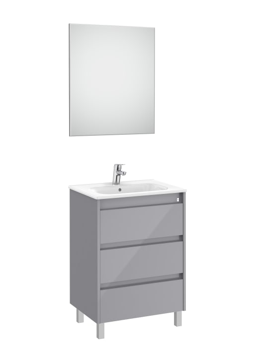 Pack TENET. Conjunto de mueble base tres cajones modelo TENET con lavabo, espejo y aplique led. Acabado gris brillo medida 600x453. Cajones con cierre amortiguado. No incluye grifería