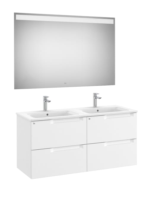 PACK - Conjunto de mueble base de cuatro cajones, lavabo doble y espejo Eidos con luz LED integrada en la parte superior. No incluye patas ni grifería.
