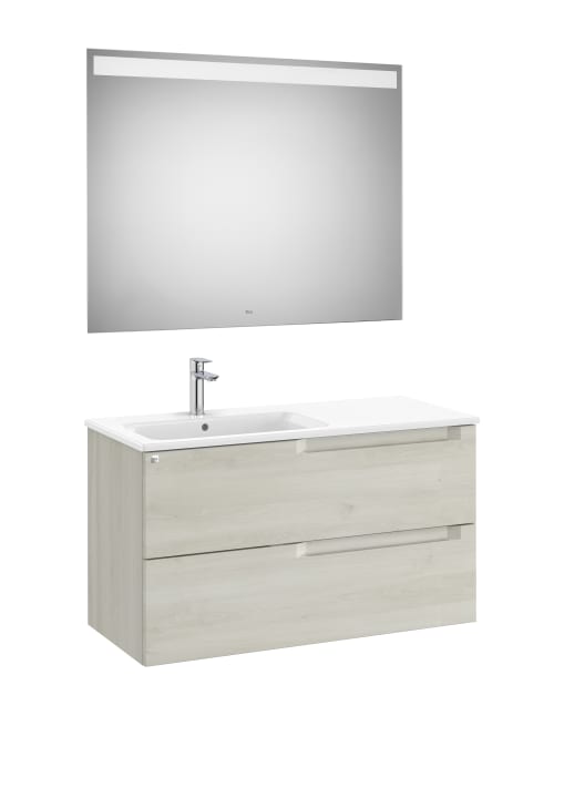 Pack ALEYDA. Conjunto de mueble base dos cajones modelo ALEYDA con lavabo desplazado a la izquierda y espejo EIDOS . Acabado blanco madera medida 1000x460. Cajones con cierre amortiguado. No incluye grifería