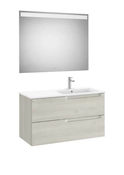 Pack ALEYDA. Conjunto de mueble base dos cajones modelo ALEYDA con lavabo desplazado a la derecha y espejo EIDOS . Acabado blanco madera medida 1000x460. Cajones con cierre amortiguado. No incluye grifería