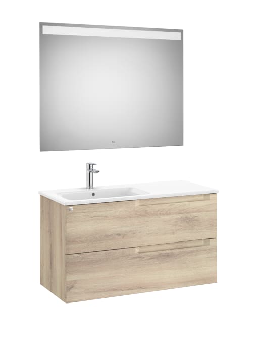 PACK - Conjunto de mueble base de dos cajones, lavabo a la izquierda y espejo Eidos con luz LED integrada en la parte superior. No incluye patas ni grifería.