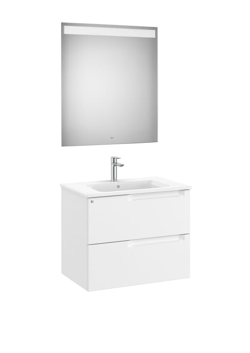 Pack ALEYDA. Conjunto de mueble base dos cajones modelo ALEYDA con lavabo centrado y espejo EIDOS . Acabado blanco mate medida 700x460. Cajones con cierre amortiguado. No incluye grifería