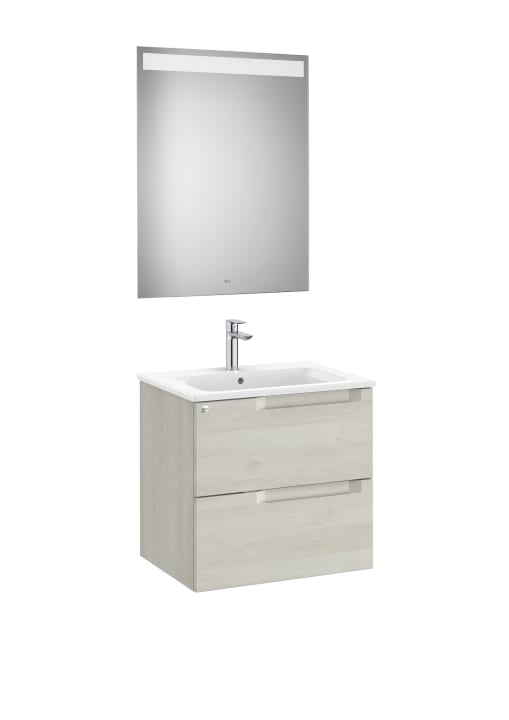 PACK - Conjunto de mueble base de dos cajones, lavabo y espejo Eidos con luz LED integrada en la parte superior. No incluye patas ni grifería.