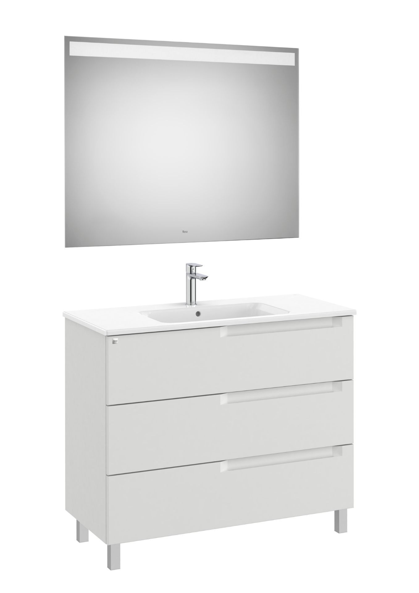 PACK - Conjunto de mueble base de tres cajones, lavabo centrado y espejo Eidos con luz LED integrada en la parte superior. No incluye patas ni grifería.
