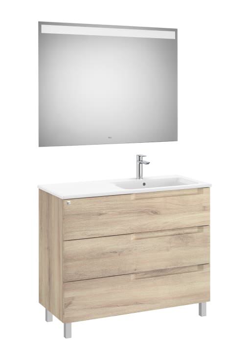 Pack ALEYDA. Conjunto de mueble base tres cajones con patas incluidas modelo ALEYDA con lavabo desplazado a la derecha y espejo EIDOS . Acabado beige madera medida 1000x460. Cajones con cierre amortiguado. No incluye grifería