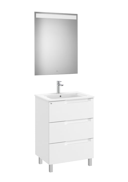 Pack ALEYDA. Conjunto de mueble base tres cajones con patas incluidas modelo ALEYDA con lavabo centrado y espejo EIDOS . Acabado blanco mate medida 600x460. Cajones con cierre amortiguado. No incluye grifería