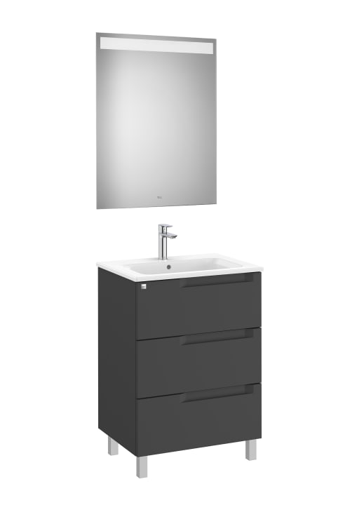 Pack ALEYDA. Conjunto de mueble base tres cajones con patas incluidas modelo ALEYDA con lavabo centrado y espejo EIDOS . Acabado negro mate medida 600x460. Cajones con cierre amortiguado. No incluye grifería