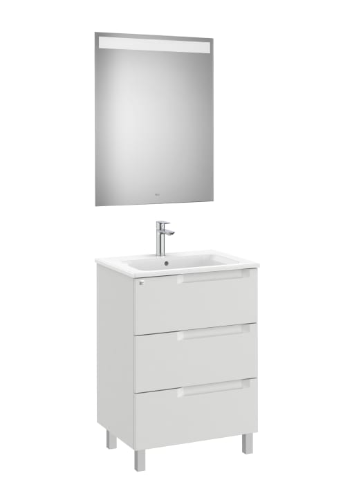 PACK - Conjunto de mueble base de tres cajones, lavabo y espejo Eidos con luz LED integrada en la parte superior. Incluye patas.