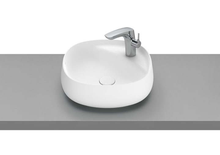 Lavabo de FINECERAMIC® de sobre encimera. No incluye grifería. Incluye desagüe universal con tapón cerámico Ø 72 mm.